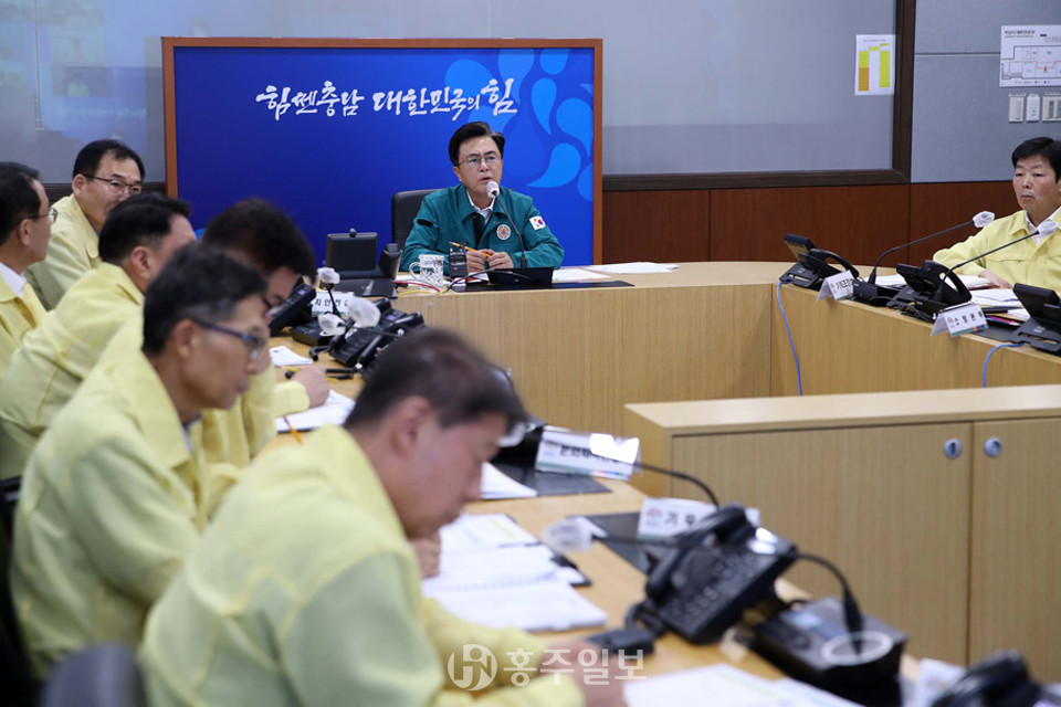 도는 지난 8일 도청 재난안전상황실에서 태풍 카눈 대비 상황 점검회의를 개최했다.<사진> 윤석열 대통령 주재 정부 점검회의에 이어 연 이날 회의에는 김태흠 지사와 실국원장이 참석하고, 15개 시군 단체장 또는 부단체장이 각 시군청에서 영상으로 참여했다.