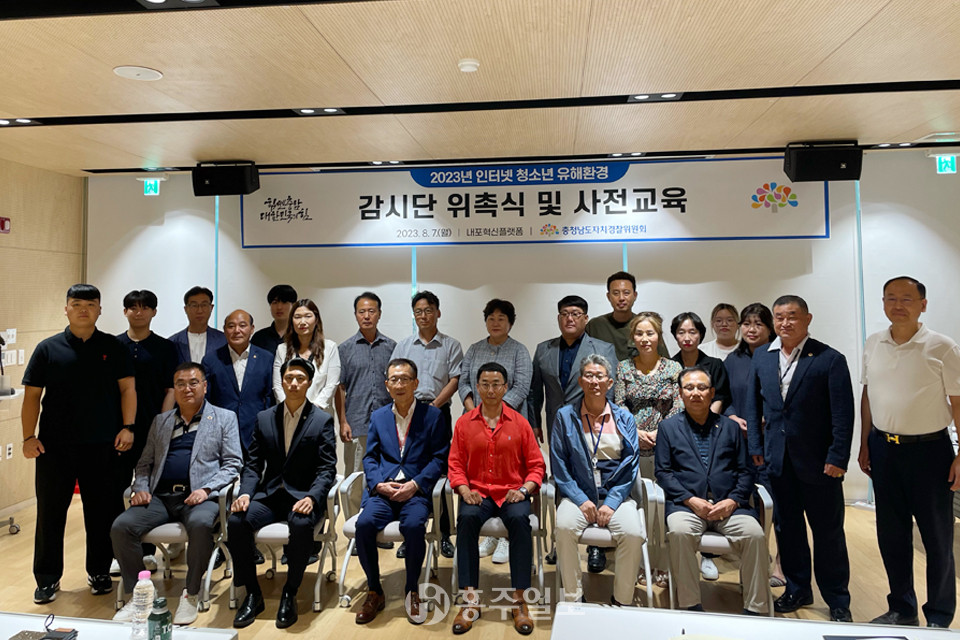 충남자치경찰위원회(위원장 권희태, 이하 위원회)는 지난 7일 충남 내포혁신플랫폼에서 온라인상 유해환경 개선을 통한 청소년 디지털 범죄 예방을 위해 인터넷 청소년 유해환경 감시단 36명을 위촉했다.<사진>
