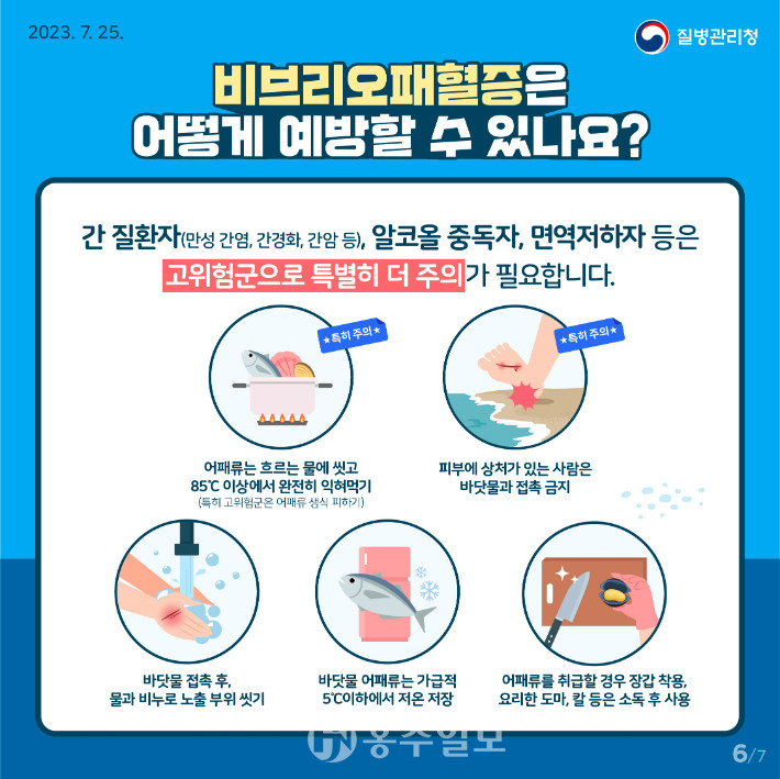 김정식 홍성군보건소장은 “최근 폭염으로 인해 해수 온도가 상승해 비브리오패혈증 예방수칙을 잘 지키는 것이 매우 중요하다”며 “피부에 상처가 있는 사람은 상처에 바닷물이 직접 닿지 않도록 해야 하며, 어패류, 게, 새우 등 날 것 섭취를 피하고 조리해 먹을 것을 당부한다”고 전했다.