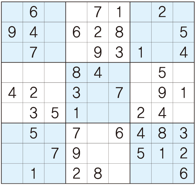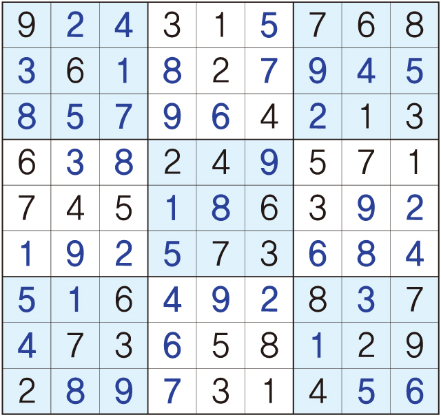 3. 큰 정사각형(9x9) 안에 있는 작은 정사각형(3x3) 안에는 숫자 1~9가 각 한 번씩 들어간다.