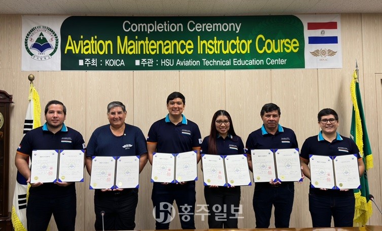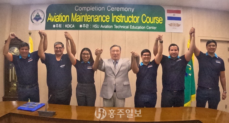 한서대학교(총장 함기선)는 함기선 총장과 김연명 항공부총장, 정한석 한스국제항공대학학장보·항공기술교육원 교수들이 참석한 가운데 태안캠퍼스 대회의실에서 ‘파라과이 항공청 소속 항공정비교관 초청 연수 수료식’이 진행했다.<사진>