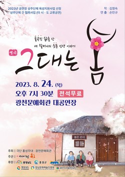 오늘 저녁 광천문예회관에서 한 편의 연극 무대가 펼쳐진다. 24일 오후 7시 30분 타 시·도 교류공연의 일환으로 경상남도 함안의 극단 ‘아사랑’이 ‘그대는 봄’라는 제목으로 홍성군민을 만난다.