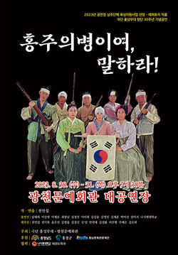 오는 30일과 31일 양일간 광천문예회관에서 무료 공연으로 펼쳐지는 극단 홍성무대 창단 30주년 기념공연 ‘홍주의병이여 말하라’는 전인섭 작, 연출로 1906년 홍주성 전투를 되새겨보며 국가를 위해 목숨을 바친 수 많은 의병들의 이야기이다. 일본군에 맞선 의병들은 서로를 다독이고 격려하며 목숨을 바쳐 나라를 위해 싸우자며 다짐하는 민초들의 이야기를 엮어냈다.