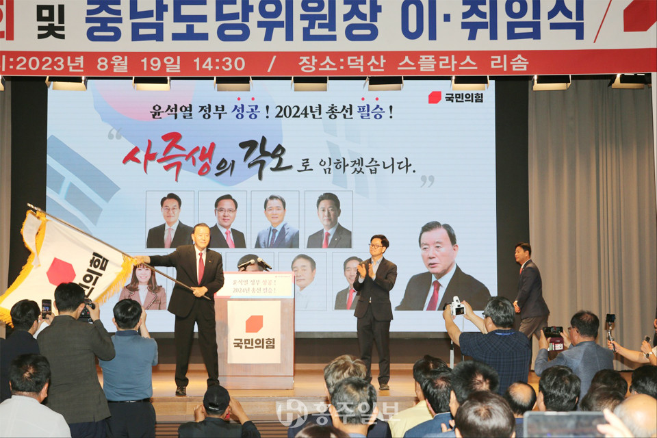 국민의힘 충남도당(위원장 홍문표)은 지난 19일 예산 스플라스 리솜 대회의장에서 2000여 명의 당원이 참석하는 등 뜨거운 열기 속에 내년 충청권 총선 압승을 위한 당원대회와 충남도당위원장 이·취임식을 성황리에 개최했다.<사진>