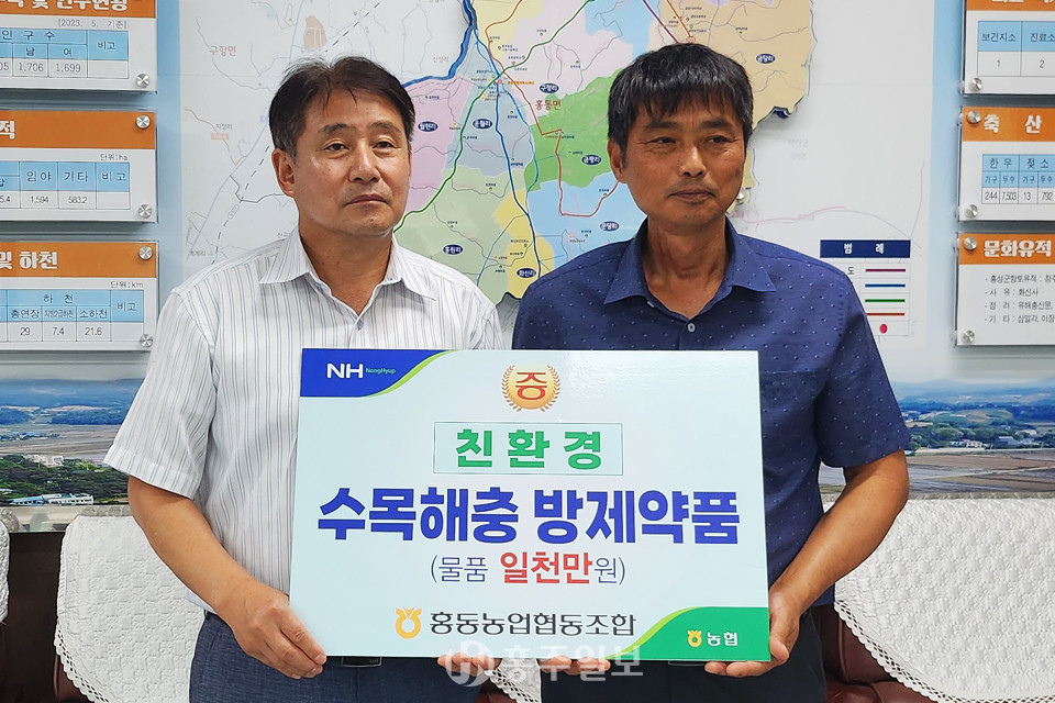 홍동농업협동조합(조합장 주정산)은 지난 22일 홍동면에 1000만 원 상당의 산림병해충 긴급방제용 친환경 약품을 기탁했다.<사진>