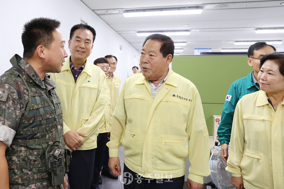 충남도의회(의장 조길연)은 23일 충남도청 전시종합상황실을 방문해 훈련 상황을 점검하고 24시간 근무 중인 근무자들을 격려했다.<사진>