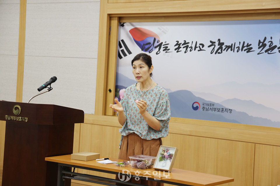 이날 교육은 국가유공자 건강·문화 프로그램의 일환으로 대한민국상이군경회 충남지부가 주최하고 국가보훈부와 충남서부보훈지청의 후원으로 개최됐으며, 관내 보훈가족 30여 명이 참여한 가운데 신용순 화목회 단독회장을 강사로 초청해 생화를 특수 보존 처리 용액으로 가공한 프리저브드 플라워(Preserved Flower) 액자 장식 실습 교육으로 진행됐다.