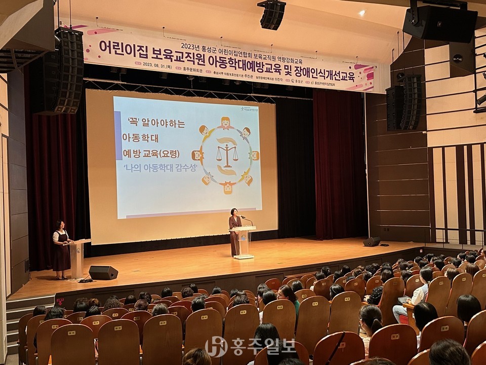 아동친화도시 홍성군이 지난달 31일 관내 어린이집 보육교직원 400여 명을 대상으로 홍주문화회관 대강당에서 방역수칙을 준수, 아동학대예방 교육을 실시했다.<사진>