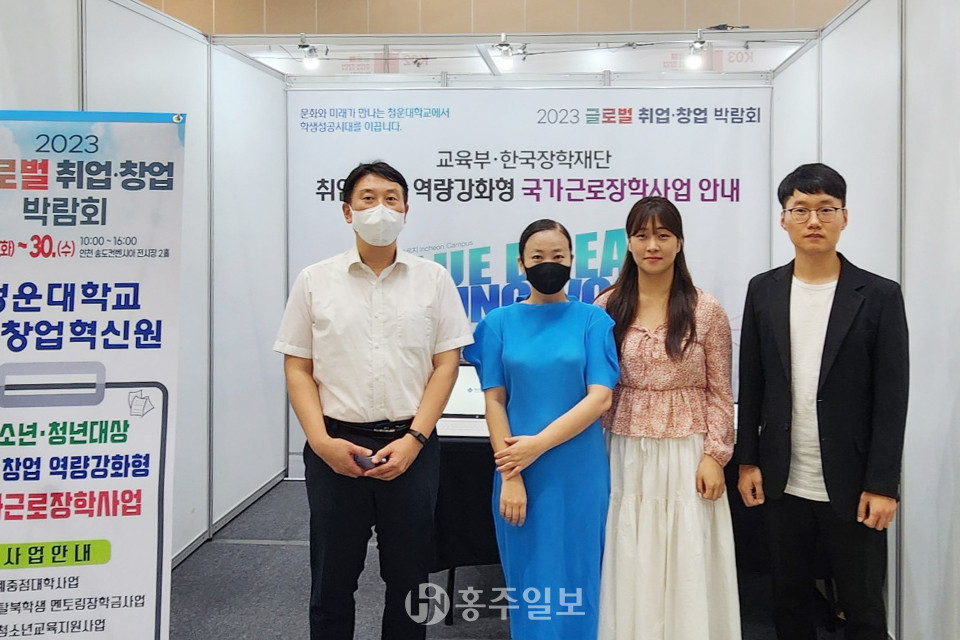 청운대학교(총장 정윤) 취·창업혁신원(원장 박두경)은 지난달 29~30일 ‘인천지방중소벤처기업청’이 주최하고 ‘㈜채움에이치알디’가 주관한 ‘2023 글로벌 취업·창업 박람회’에 참여해 부스를 운영했다.<사진>