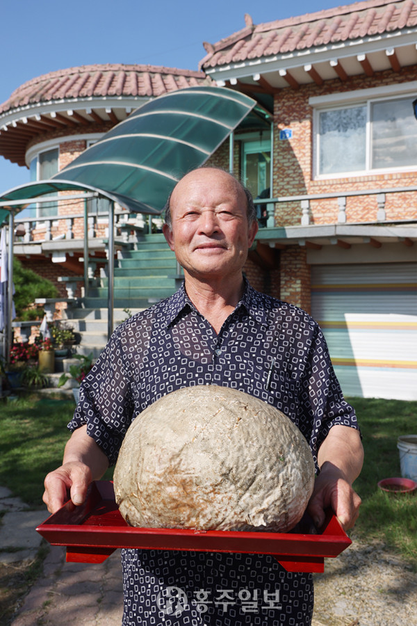 이 댕구알버섯은 둥근 공 모양에 지름이 약 40㎝로 무게가 2.2Kg에 달하며 환한 회색을 띠고 있다.