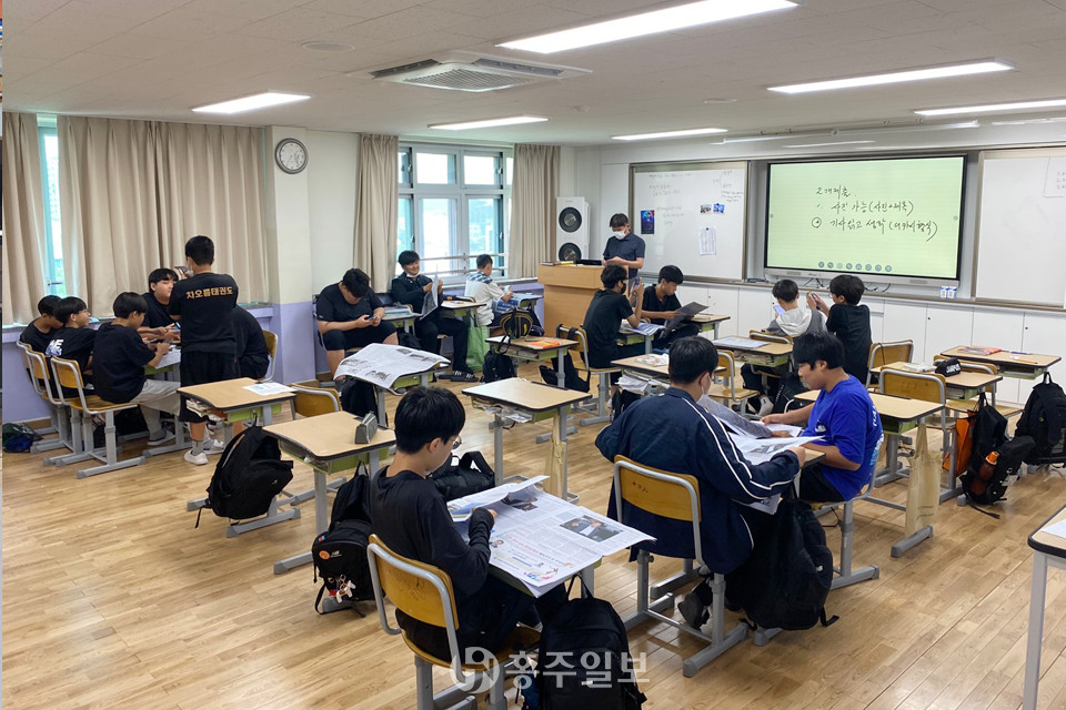 특히 올해는 홍성고등학교, 홍성여자고등학교, 홍주고등학교, 홍주중학교, 내포중학교 등 5개 학교에 홍주신문을 매주 배부했다. 그중 홍주중학교(교장 윤한석)는 김재범 국어교사를 중심으로 지난 한 학기 동안 1학년 학생을 대상으로 홍주신문을 활용한 수업을 진행했다.<사진>