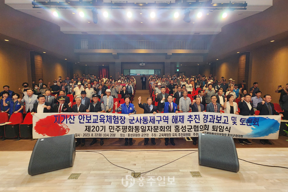 민주평화통일자문회 홍성군협의회(회장 오석범)는 지난달 22일 홍성문화원에서 관계자와 지역주민 등 200여 명이 참석한 가운데 지기산 교육체험장유치와 군사통제구역 해제 추진 경과보고와 제20기 퇴임 행사를 개최했다.<사진>