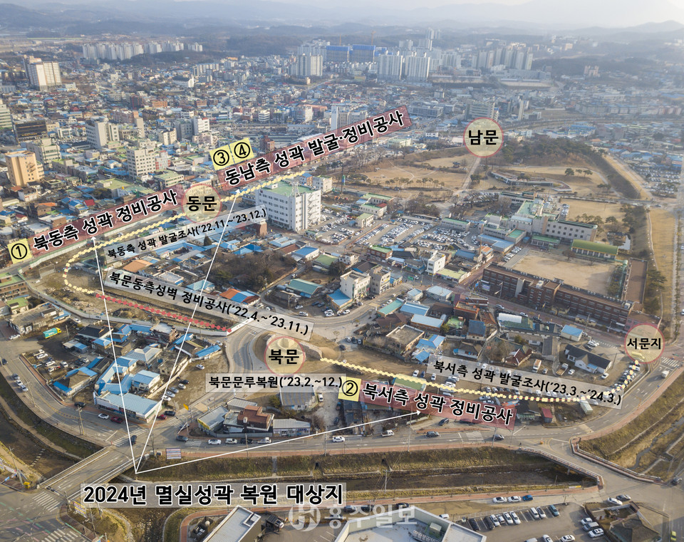 한편 홍성군은 멸실된 성벽 복원·정비를 위한 마지막 관문인 조양문 남측 구간 홍성농협 오관지점 3필지의 매입 동의를 받은 후 농협 측에서 이전 장소를 물색 중이며, 국제열쇠 등 4필지는 토지수용 절차를 진행 중이다.