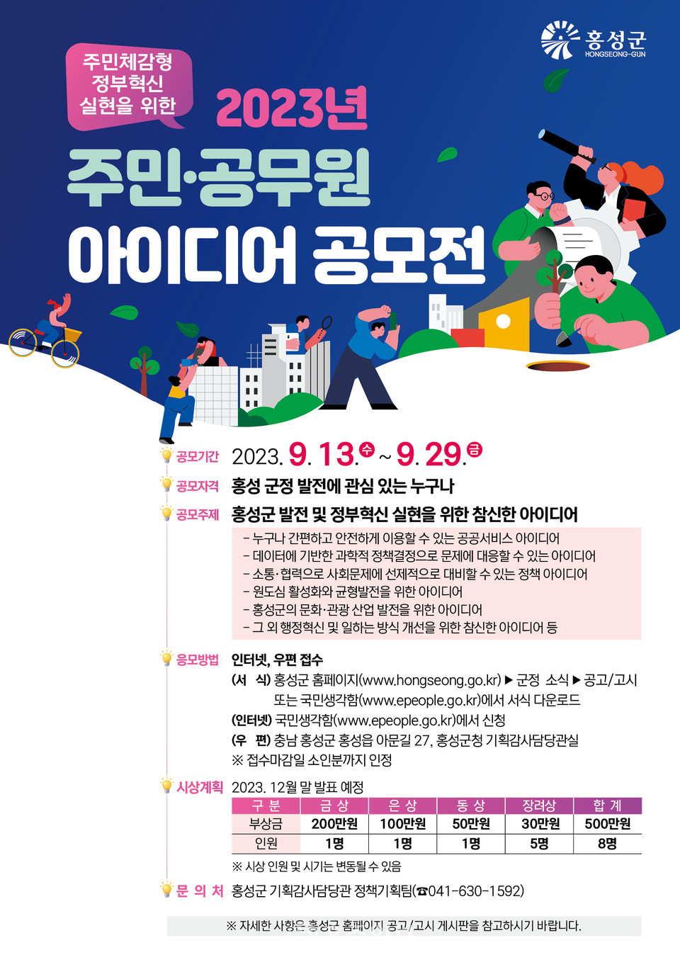 홍성군은 9월 13~29일까지 17일간 ‘주민체감형 정부혁신 실현을 위한 2023년 주민·공무원 아이디어 공모전’을 개최한다고 밝혔다.