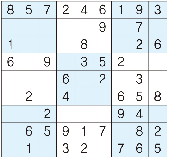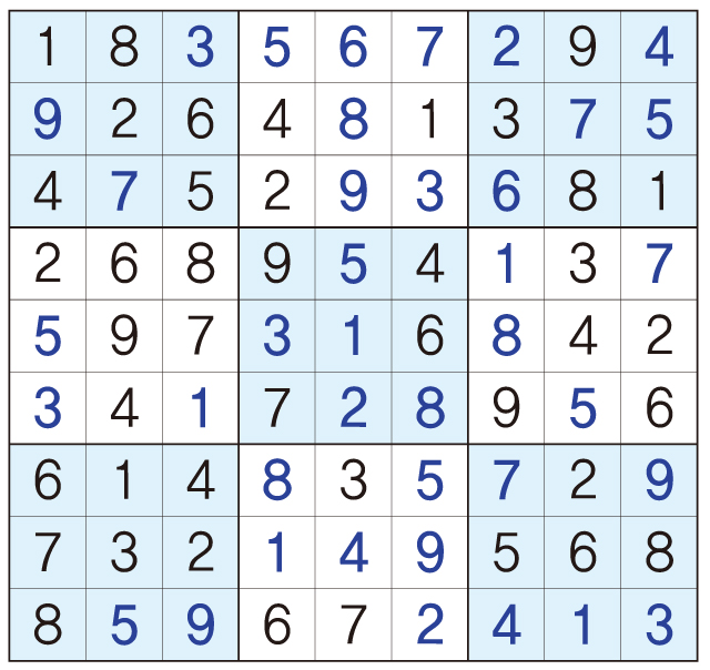 3. 큰 정사각형(9x9) 안에 있는 작은 정사각형(3x3) 안에는 숫자 1~9가 각 한 번씩 들어간다.