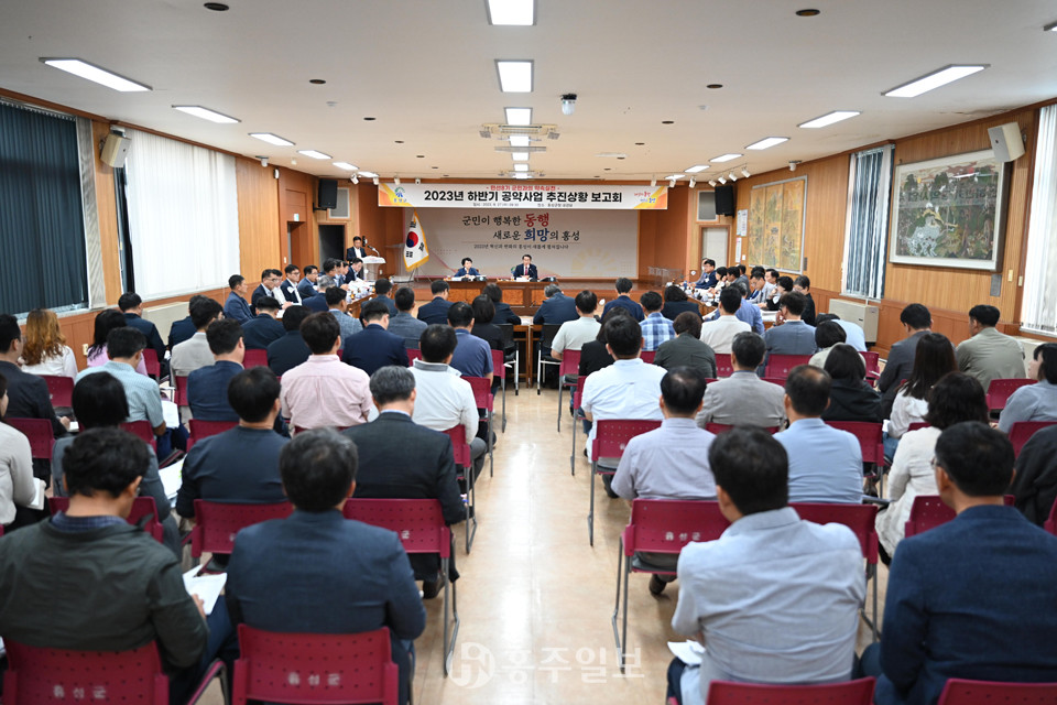 홍성군은 지난달 27일 군청 대강당에서 민선8기 이용록 홍성군수의 공약사업 추진상황 보고회를 개최하고 지난 1년 동안 공약사업 추진상황에 대한 보고와 향후 방향에 대해 고민하는 시간을 가졌다.<사진>