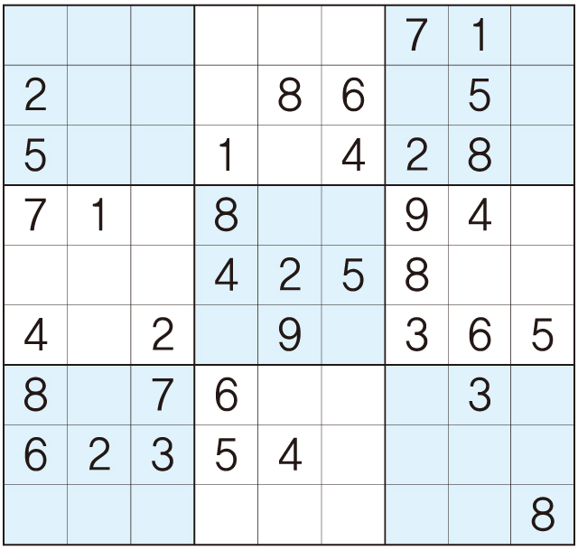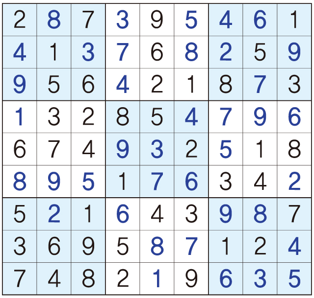 3. 큰 정사각형(9x9) 안에 있는 작은 정사각형(3x3) 안에는 숫자 1~9가 각 한 번씩 들어간다.