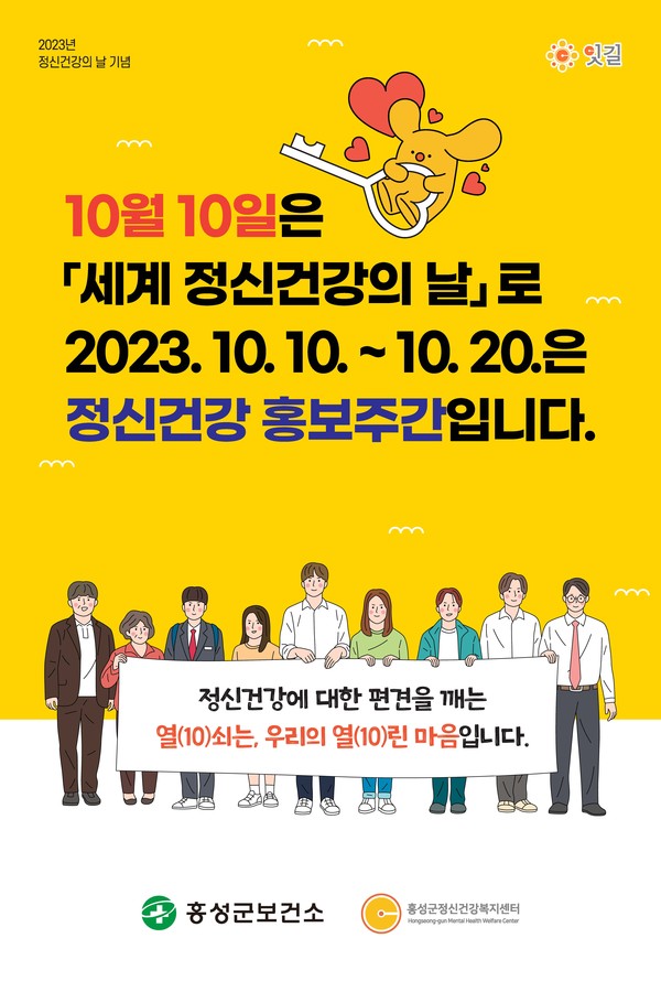 올해 10월 10일부터 10월 20일까지는 보건복지부에서 지정한 정신건강 홍보주간으로 홍성군은 ‘정신건강에 대한 편견을 깨는 열(10)쇠는, 우리의 열(10)린 마음입니다’라는 슬로건을 내세워 정신건강 캠페인을 펼친다.