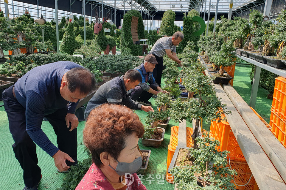 국화 분재 분갈이·꽃 솎기 작업에 구슬땀