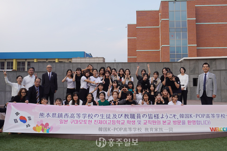 지난 4일 일본 구마모토현에 위치한 친제이고등학교(교장 히노 고시) 학생과 교장·교감·관계자 15명이 한국K-POP고등학교(교장 박병규)를 방문했다.<사진>
