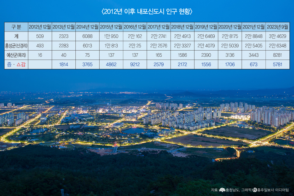 충남도 관계자는 “충남내포혁신도시 인구가 당초(2020년 10만 명) 계획에는 한참 미치지 못하고 있는 것이 현실이지만 아파트 입주 물량이 지속적으로 뒷받침하고 있는 상황에서 충남도가 중점 추진 중인 종합병원 조기 개원과 충남혁신도시 지정에 따른 공공기관·기업 유치, 서해선고속전철 KTX 연결을 비롯한 정주여건 개선 등이 급물살을 타게 되면 급격하게 인구가 유입될 것으로 기대된다”고 밝히고 있다.