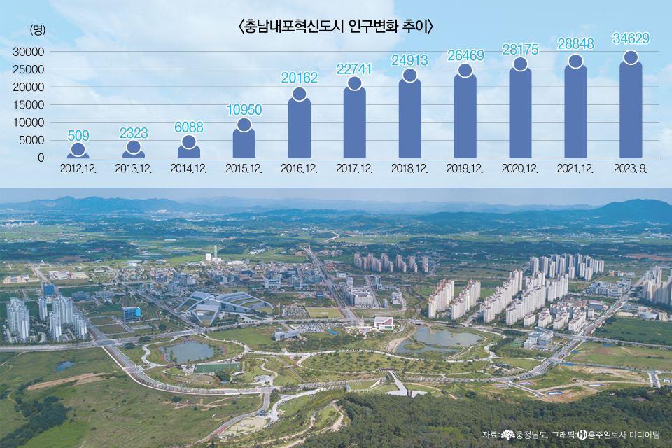충남도에 따르면 지난 9월 말 기준 충남내포혁신도시 인구는 3만 4629명으로 집계됐다. 지난 8월 말 3만 4229명에 비해 200명 늘어난 규모다. 출범 첫해인 2012년 말 충남도청내포신도시 인구는 509명에서 시작해 2015년 말 1만 950명, 2016년 말 2만 162명으로 급증했다.
