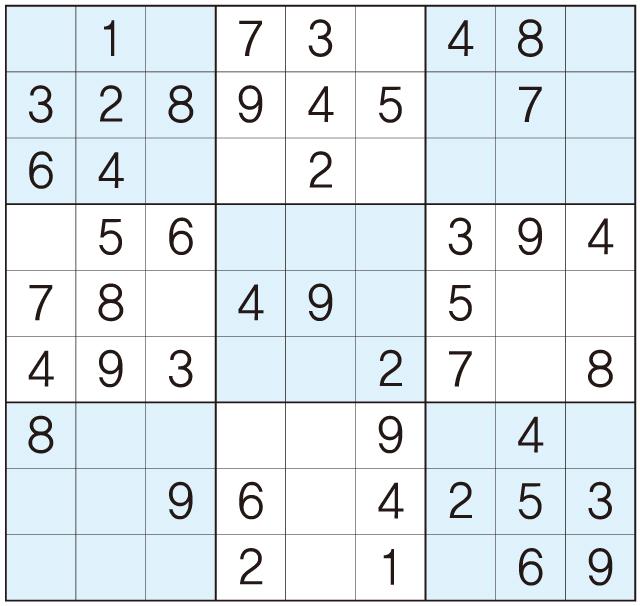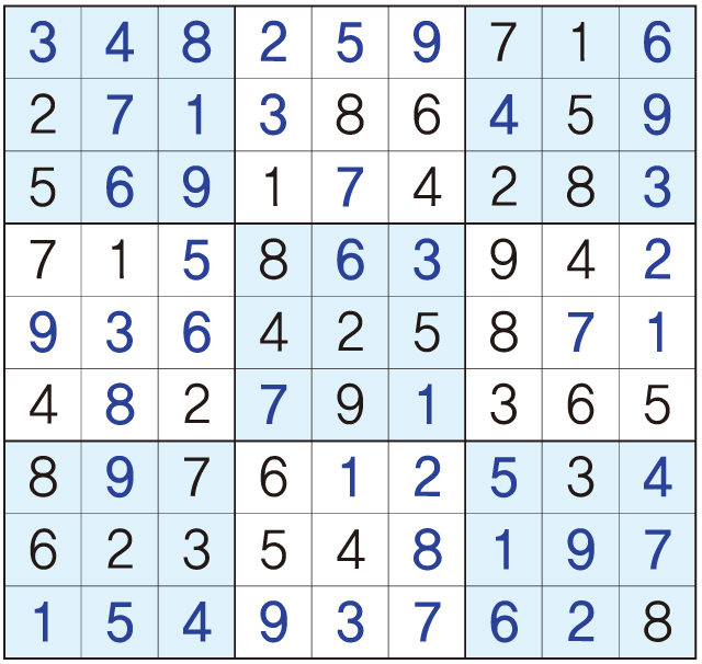 3. 큰 정사각형(9x9) 안에 있는 작은 정사각형(3x3) 안에는 숫자 1~9가 각 한 번씩 들어간다.