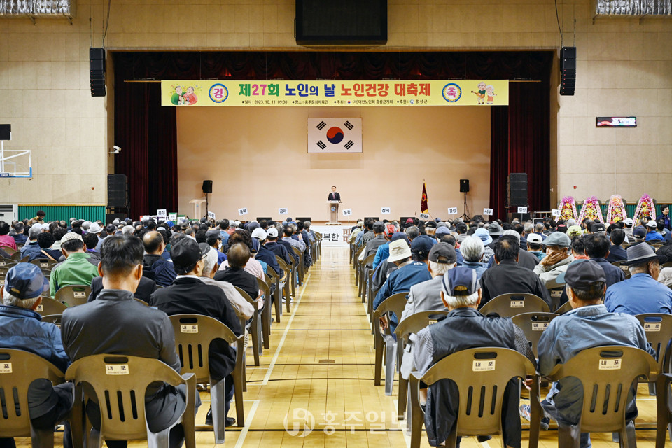 홍성군은 지난 11일 홍주문화체육센터에서 노인의 날을 기념하고 어르신 화합과 소통을 장을 마련하고 경로효친 사상을 고취하기 위해 지역 어르신 1000명을 초청해 ‘제27회 노인의 날 기념 노인건강대축제’를 개최했다.<사진>