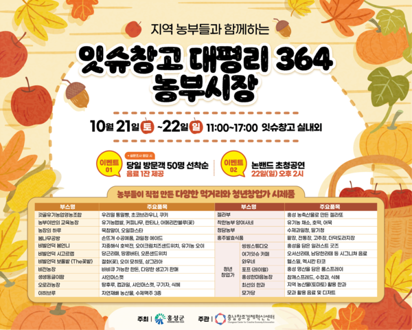 홍성복합문화창업공간 잇슈창고에서 오는 21일과 22일 ‘잇슈창고 대평리 364 농부시장(주최 홍성군, 주관 충남창조경제혁신센터)’을 개최한다.