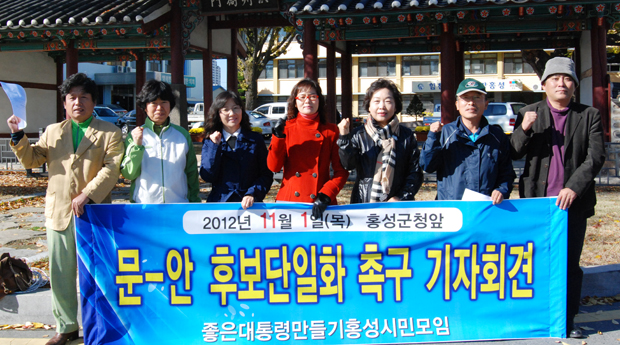 홍성YMCA(이사장 유요열), 홍성민주발전동지회(회장 오영남), 참교육학부모회 홍성지회(회장 김순희) 등이 참여한 '좋은대통령만들기홍성시민모임'은 지난 1일 군청 앞에서 기자회견을 갖고 문재인 민주통합당 후보와 안철수 무소속 후보의 단일화를 촉구했다.