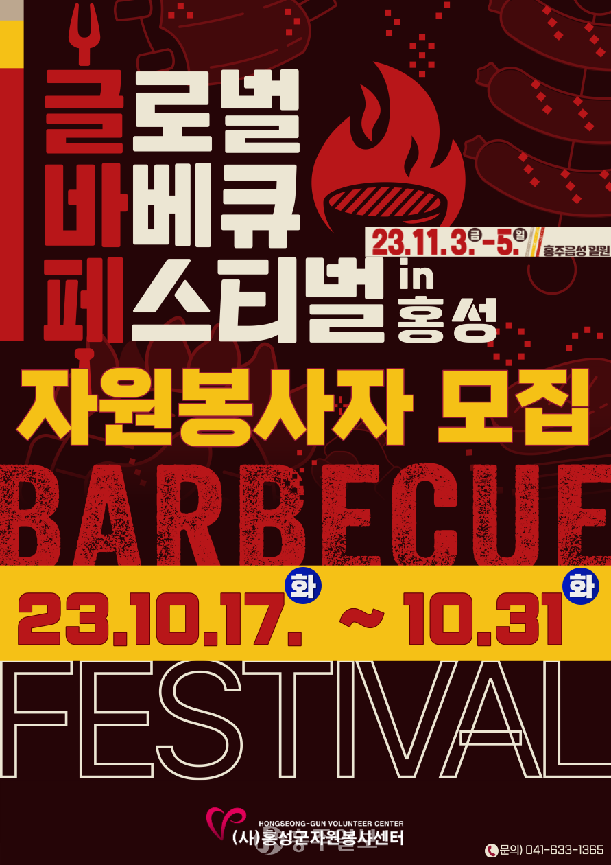 ㈔홍성군자원봉사센터는 오는 31일까지 ‘글로벌바베큐페스티벌 in 홍성’의 성공적 운영에 힘을 더해 줄 자원봉사자를 모집한다고 밝혔다.