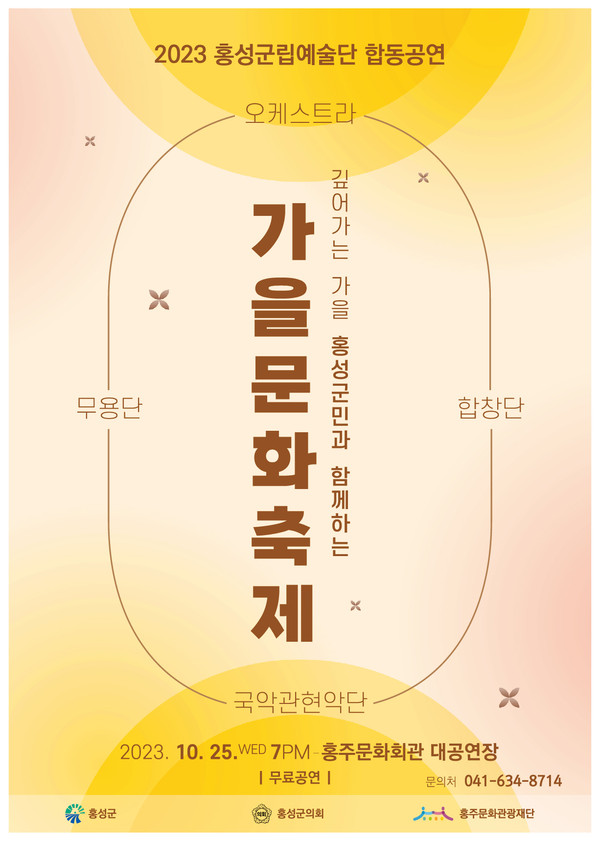 홍성군립예술단 합동공연 ‘가을 문화 축제’가 오는 25일 오후 7시 홍주문화회관 대공연장에서 펼쳐진다.