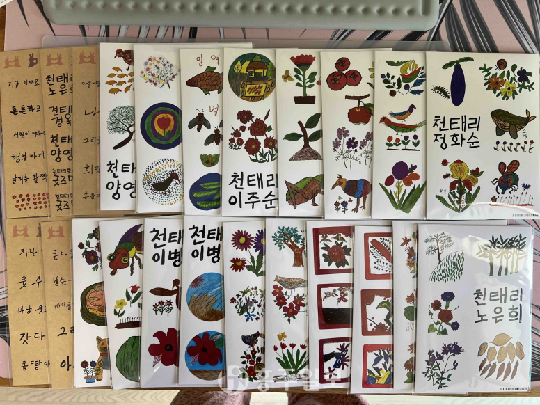 이번에는 ‘천태리의 자연을 디자인하다-요새는 벌이 읍써’라는 전시 주제로 그동안 디자인한 종이캘린더, 고무신, 마우스패드 등 13종의 굿즈를 ‘글로벌바베큐페스티벌 in 홍성’에서 선보이고 판매할 예정이다.