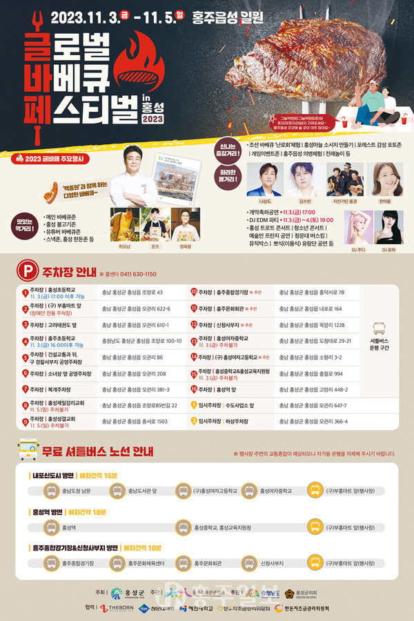 ‘2023 글로벌바베큐페스티벌 in 홍성’와 관련해 행사일정, 주차장 안내, 무료 셔틀버스 노선 안내 등 자세한 사항은 본지 16면을 참고하면 된다.