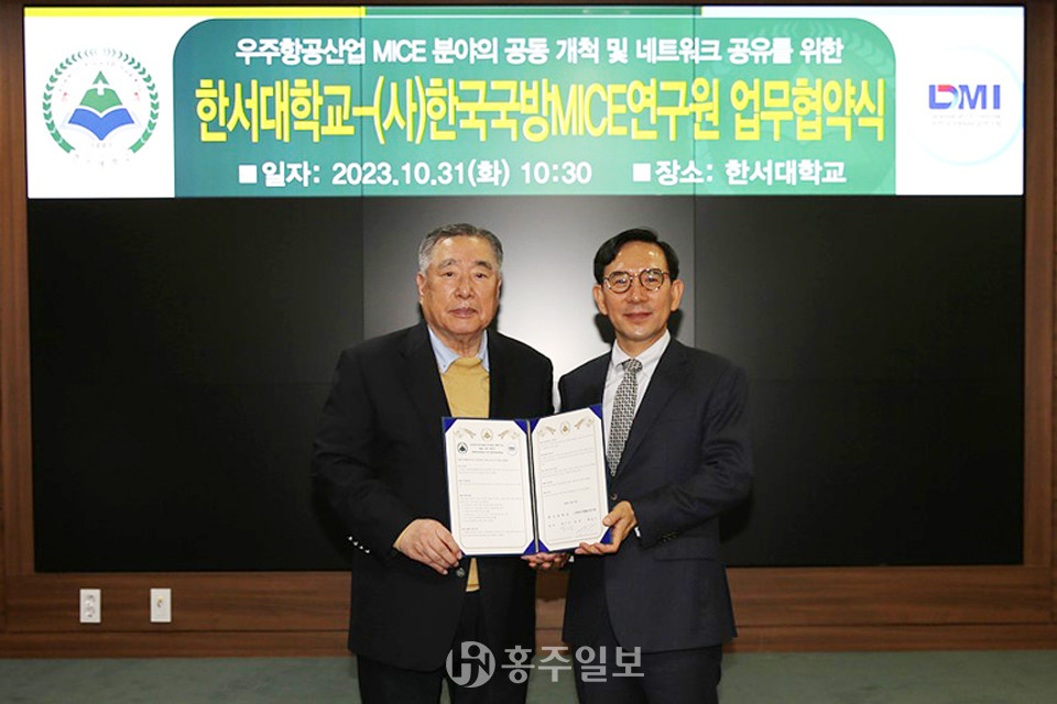 한서대학교(총장 함기선)가 한국국방MICE연구원과 지난달 31일 항공우주 산업의 MICE분야를 공동으로 개척하고 양 기관이 보유한 관련 네트워크를 공유하는 것을 주요 내용으로 하는 업무협약을 체결했다.<사진>