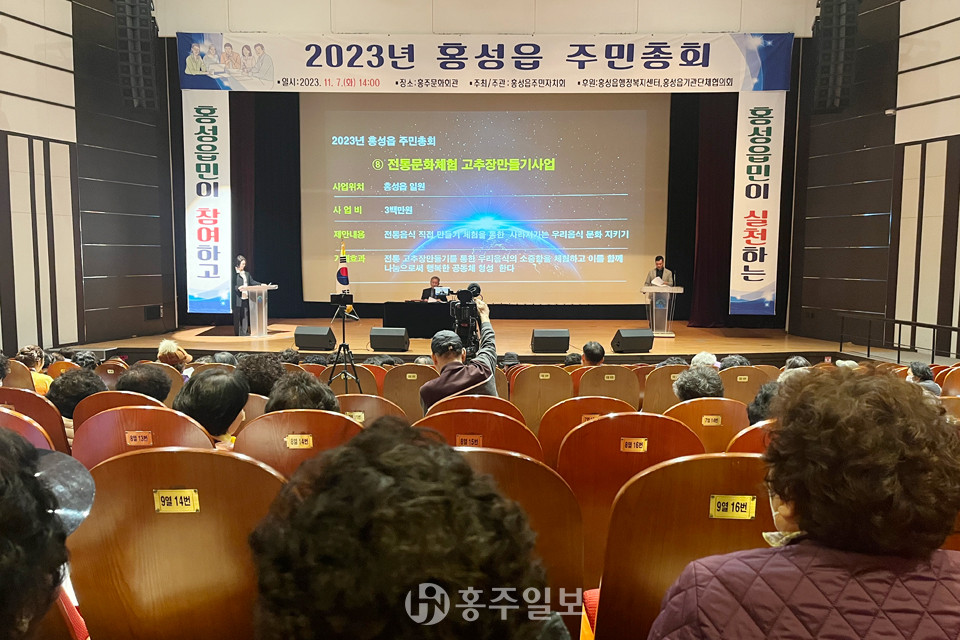 2023년 홍성읍주민총회에 상정된 10가지 의제는 △어르신 IT 교육·PC보급 사업 △쿨링포그 시스템(폭염저감 시설) △우리집 농장 가꾸기·농기구·생활공구 대여 사업 △안심해U 보이는 소화기 비치사업 △가가호호 문패 달아주기 △EM발효액 활용한 ‘하천을 살리는 착한공’ △공용자전거 공기주입기 설치 △찾아가는 마을 관리소 △전통문화체험 고추장만들기 △재활용품 수집으로 생계를 이어가는 노인을 위한 안전용품 지급 등이었다.