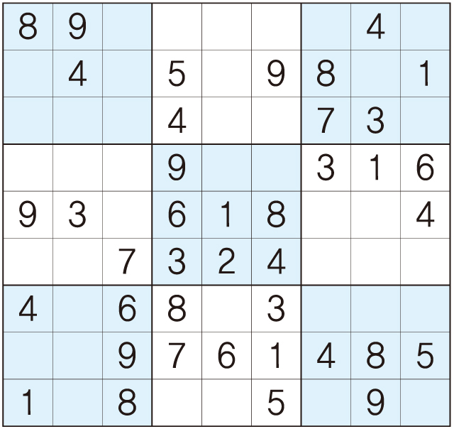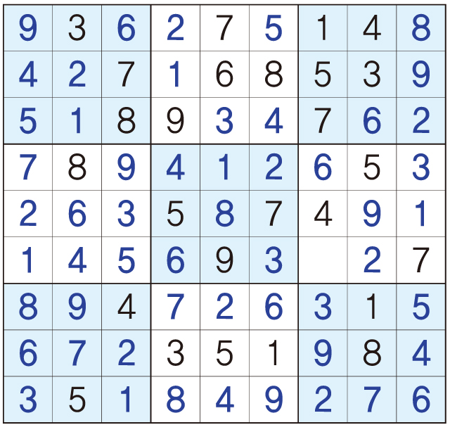 3. 큰 정사각형(9x9) 안에 있는 작은 정사각형(3x3) 안에는 숫자 1~9가 각 한 번씩 들어간다.