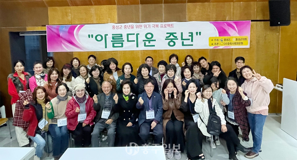 (사)충청사람과문화(이사장 정윤)는 ‘홍성군 중년을 위한 위기 극복 프로젝트-아름다운 중년’을 진행했다. 홍성군민 46명과 함께 진행된 이번 워크숍은 지난 10~11일 1박2일로 공주 한국문화연수원에서 나를 나답게, 박정소의 힐링콘서트, 이미지 메이킹 강의, 인체의 신비 등을 통해 2차를 진행했으며 1차는 홍성군민 47명이 지난달 13~14일 1박2일동안 대천한화콘도에서 진행 됐다.<사진>