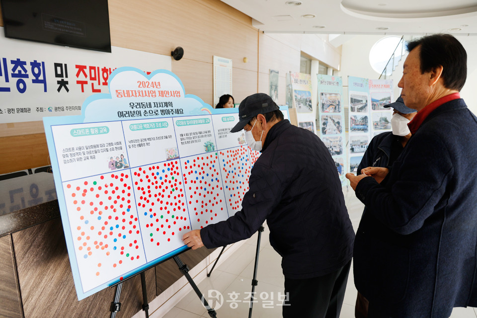 김노성 광천읍주민자치회장은 “우리 광천읍주민자치회는 앞으로도 주민과 소통하며 살기 좋은 광천읍을 만들기 위해 노력할 것이며, 주민총회를 통해 결정된 사업을 잘 추진해 마을 발전을 위해 앞장서겠다”고 말했다.