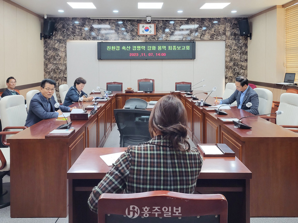 홍성군의회 의원 연구단체인 ‘친환경 축산 경쟁력 강화 정책연구회(대표의원 김덕배)’는 지난 7일 의회 소회의실에서 ‘친환경 축산 경쟁력 강화 정책 연구 용역 최종보고회’를 개최했다.<사진>
