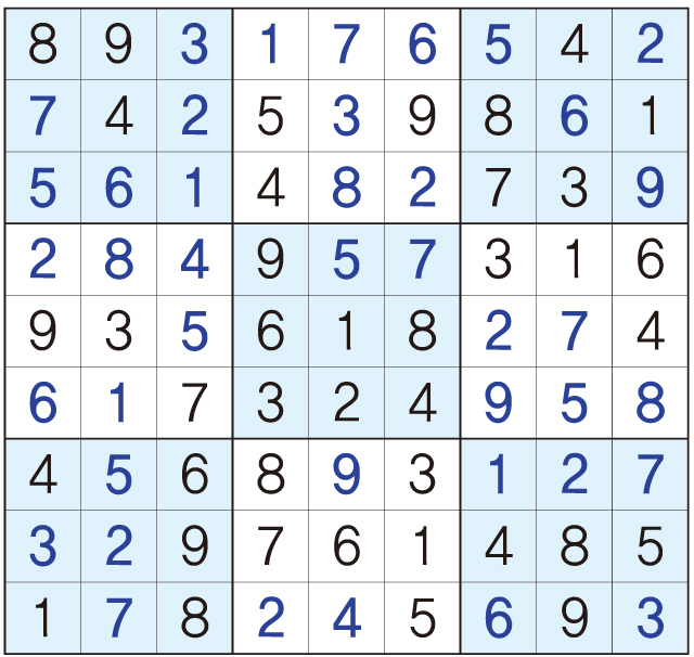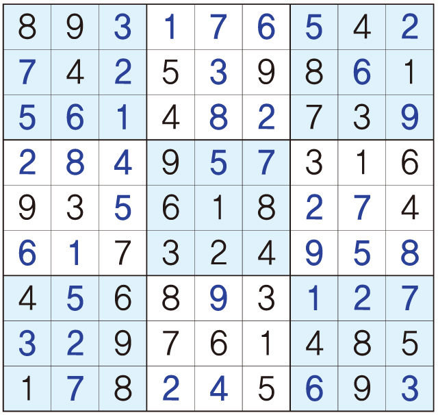 3. 큰 정사각형(9x9) 안에 있는 작은 정사각형(3x3) 안에는 숫자 1~9가 각 한 번씩 들어간다.
