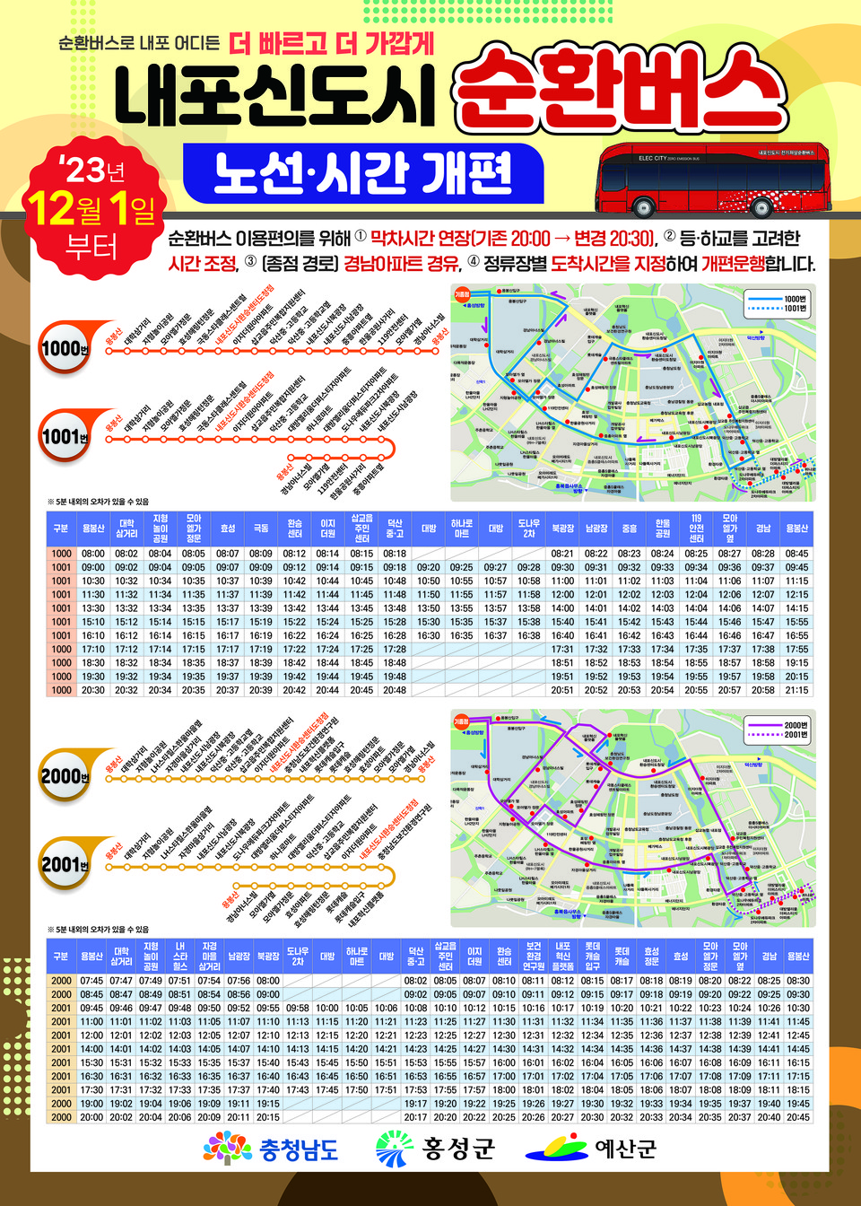 도는 주민이 내포 순환버스를 편리하게 이용할 수 있도록 주민 대상 온라인 홍보 및 홍보물 배부 활동을 펴고 정류장 게시물 변경을 통해 오프라인 홍보도 병행할 계획이다.