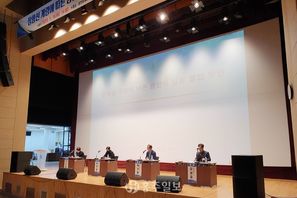 광천읍주민자치회(회장 김노성)·광천읍이장연합회(회장 박창덕) 주최로 광천읍을 통과하는 장항선 노선 변경이 확정된 부분에 대한 해법을 찾기 위한 ‘장항선 개량에 따른 광천역 일원 활용방안 읍민토론회’가 지난 15일 광천문예회관에서 개최됐다.<사진>