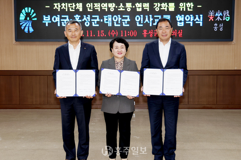 홍성군이 행정역량을 강화하고 인근 지자체와 상호협력체계 구축을 통한 상생발전을 도모하기 위해 지난 15일 홍성군청에서 부여군, 태안군과 인사교류 협약을 체결했다고 밝혔다.<사진>