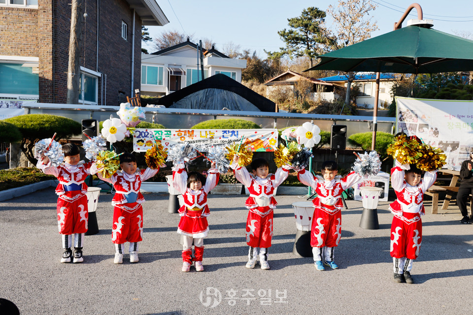 지난 21일 장곡면행정복지센터 앞에서 열린 ‘2023 장곡 행복 나눔 잔치’에서 장곡초등학교 병설유치원 학생들이 행사의 피날레를 장식하며 관객들의 열화와 같은 성원과 함께 기립 박수를 받았다. 공연을 마친 원아들은 사회자의 소감 등을 묻는 질문에 일제히 “예”라고 단답으로 대답해 관객들을 폭소케하기도 했다.