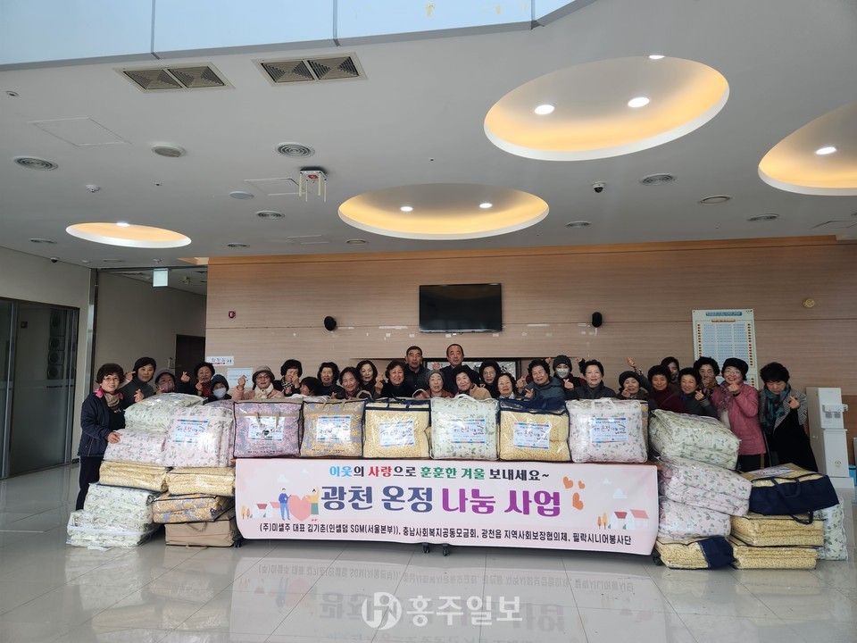 광천읍(읍장 정동규)은 지난 27일 따뜻한 겨울나기를 위한 광천온정나눔사업을 추진했다. 이번 사업 추진은 지난 9월 ㈜미셀주 김기춘 대표가 인셀덤서울본부 이름으로 충남사회복지공동모금회에서 광천읍 지역사회보장협의체로 지정 기탁한 2000만 원으로 추진됐다.<사진>