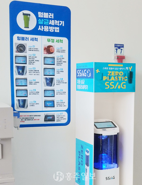 자동문으로 구분된 세척기 내부에 텀블러를 넣으면 자동으로 고압 세척과 자외선(UVC) 살균이 동시에 이뤄지며, 15∼25㎝ 텀블러는 모두 세척 가능하다.