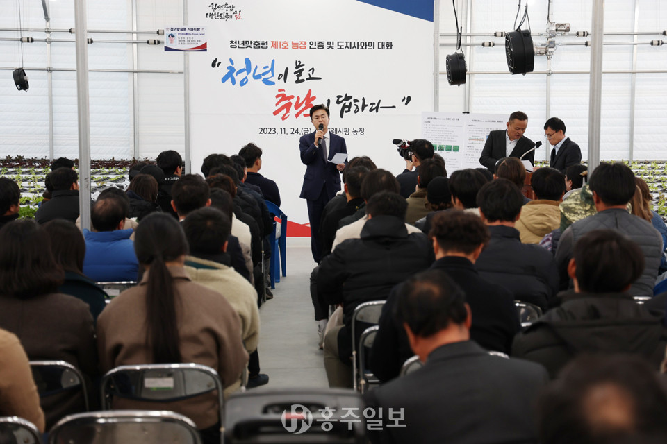 김태흠 지사와 부여군수, 도의원, 시·군의원, 도 농업기술원장, 관계 공무원, 청년농업인 등 70여 명이 참석한 가운데 연 이번 행사는 청년농 맞춤형 사업 추진 상황 보고, 청년농 맞춤형 스마트팜 현황 보고, 현판식, 도지사와의 대화 등의 순으로 진행했다.