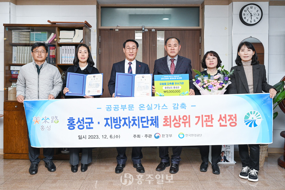 홍성군은 환경부가 주최한 2023년 공공부문 온실가스 목표관리제 운영 성과보고회에서 2022년 기준 온실가스 감축실적으로 전국 243개 지방자치단체 중에서 최상위 기관에 선정돼 환경부장관상과 포상금 500만 원을 받았다고 7일 밝혔다.<사진>