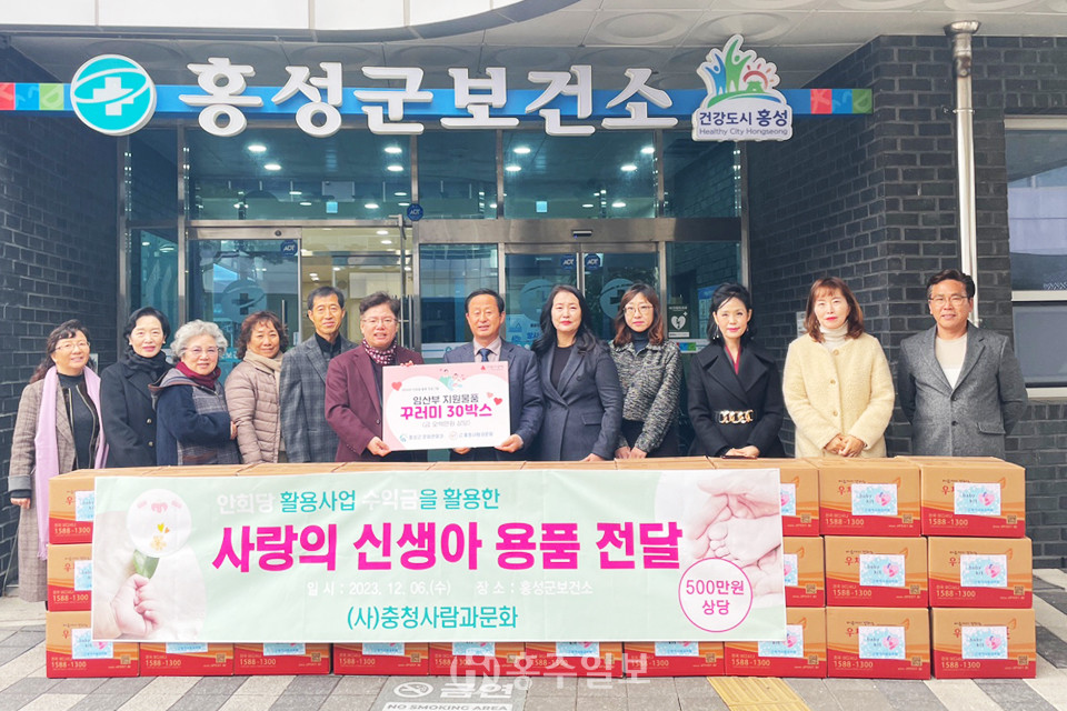 ㈔충청사람과문화(이사장 정윤)는 지난 6일 홍성군보건소를 방문해 안회당 활용사업 수익금으로 사랑의 신생아 용품 꾸러미 30박스를 전달했다.<사진>